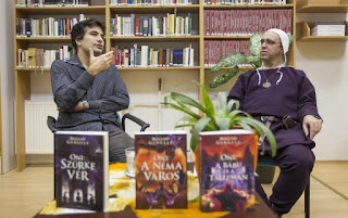 A másik aktuális téma, hogy ebben az időszakban egészen sok író-olvasó találkozón lehetett, ill. lehet majd összefutni velem. A hétvégén a debreceni Benedek Elek Könyvtárba kaptam meghívást, ahol egy nagyszabású rendezvényen a fantasy és a történelmi regény zsánerében dolgozó szerzőkkel lehetett beszélgetni. (Sajnos délután már nem tudtam ott lenni, pedig Nemes Istvánnal én is nagyon szívesen beszélgettem, dedikáltattam volna.) Engem nem is annyira az Oniról kérdeztek, mint inkább a készülő regényemről, a kutatási módszeremről. Bőven kaptam érdekes kérdéseket Jánostól, a "hivatalos" kérdezőtől, de a közönségtől is. Összességében szerintem minden klasszul sikerült, és nagyon meglepett, hogy a jelenlévők közül többen is olvastak már Oni-könyveket. Persze hoztam a formám, és a Déri Múzeumba szóló ajándékjegyemet sikerült ott felejtenem, holnap elmegyek érte. A Hajdú-Bihari Napló itt számolt be az eseményről, mindjárt két apró hibával: bár nyilván örültem, hogy megláttam a nevem a cikkben, és hogy mutathatok pár képet a blog olvasóinak, de "a hazai fantasy-irodalom jeles képviselőjeként" egyértelműen Istvánt kellett volna kiemelni, nem engem (ez nem álszerénység, csak sima tény). Másrészt civilben nem orvosként, hanem kutatóként dolgozom. :)